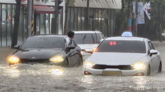 [광주=뉴시스] 이영주 기자 = 광주지역에 시간당 86㎜ 폭우가 쏟아진 17일 오후 광주 북구청 앞 교차로에서 차량들이 폭우로 넘치는 빗물에 갇혀 오가지 못하고 있다. 2025.07.17. leeyj2578@newsis.com /사진= |