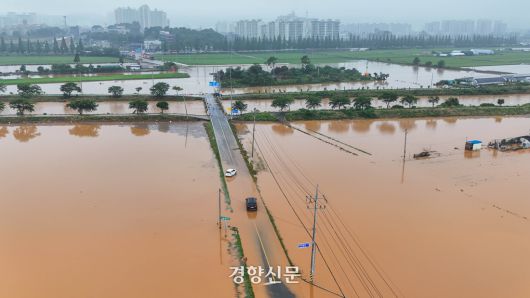 이틀 사이 520㎜에 가까운 많은 비가 쏟아진 충남 서산시 석림동 청지천 일대에서 차량들이 침수된 도로와 논 사이에 갇혀 있다. 기상청은 서산 등 충남권에 내린 비의 양이 ‘200년에 한 번 내릴 수준’이라고 밝혔다. 또한 이날 오전 1시 46분부터 1시간 동안 서산에 114.9㎜의 비가 쏟아진 것은 ‘100년 만에 한 번 나타날 수준’의 강도라고 설명했다. 2025.7.17 서산|성동훈 기자 |