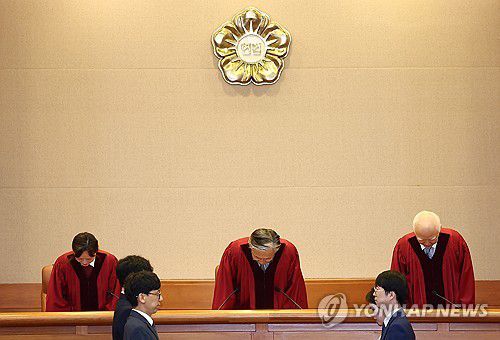 (서울=연합뉴스) 김성민 기자 = 헌법재판관들이 손준성 대구고검 차장검사(검사장) 탄핵 심판 선고를 위해 17일 서울 종로구 헌법재판소 대심판정에 들어서며 인사하고 있다. 2025.7.17