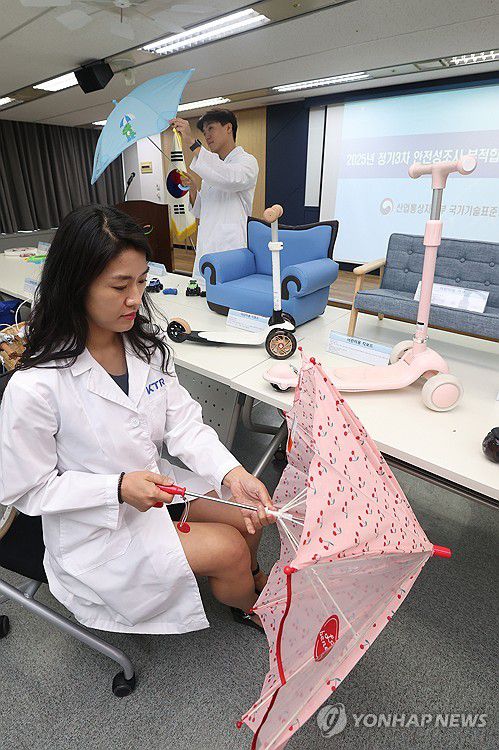 (서울=연합뉴스) 강민지 기자 = 17일 서울 서초구 한국제품안전관리원에서 관계자들이 리콜 제품을 살펴보고 있다. 산업통상자원부 국가기술표준원은 여름철 수요가 많은 물놀이기구, 여름의류ㆍ신발, 우산ㆍ양산 등 1,082개 제품에 대해 안전성 조사를 실시한 결과 안전기준에 부적합한 53개 제품에 대해 수거 등의 명령 조치를 내렸다고 밝혔다. 2025.7.17