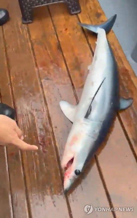 (강원 고성=연합뉴스) 17일 오전 9시 55분께 강원 고성군 현내면 대진항 동쪽 약 3.7㎞(2해리) 해상에서 한 낚시객의 낚싯대에 상어가 건져 올라왔다. 2025.7.17 [속초해양경찰서 제공·재판매 및 DB 금지]