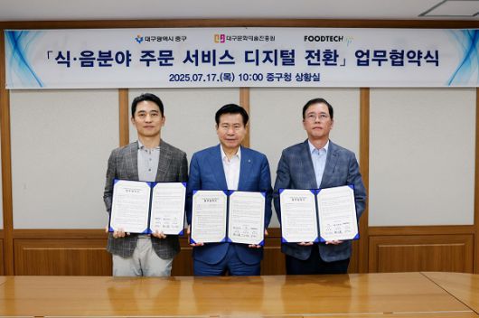대구문화예술진흥원(원장 박순태)은 7월 17일, 대구광역시 중구청(청장 류규하), ㈜푸드테크(대표 최준영)와 함께 ‘QR 다국어 메뉴판 제작 지원사업’ 추진을 위한 업무협약(MOU)을 체결하고 본격적인 공개 모집에 나선다.