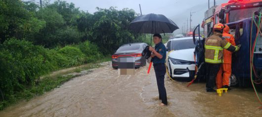 17일 오후 2시께 경북 청도군 청도읍의 한 도로가 침수돼 경찰과 소방대원 등이 차량 대피를 유도하고 있다. 경북소방본부 제공 |