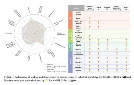 전문적인 한국어 지식을 평가하는 새로운 벤치마크 ‘KMMLU-Pro’에서 AI 모델들이 14개의 국가 전문 자격 시험을 통과했는지 보여주는 장표. 평균 점수는 오픈AI의 ‘o1’ 모델이 79.55%의 정확도로 가장 높았지만 앤스로픽의 ‘클로드 3.7 소넷’이 12개 시험을 통과하며 가장 고른 성능을 보였다. [출처 = arXiv 논문 캡처] |