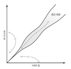 일단 무국가 사회의 ‘만인에 대한 만인의 투쟁’ 상태를 벗어나면, 국가는 독재로의 ‘미끄러운 비탈’을 달리게 된다. 저자들이 ‘엘리트 포획’이라고 부르는 이 현상은 보편적이며 관성이 강해서 독재의 경로에서 벗어나 ‘좁은 회랑’에 진입하는 확률은 낮을 수밖에 없다. 국가와 엘리트는 동의어이며, 민주주의 지속 가능 여부는 사회가 엘리트를 통제할 능력이 있는지에 달려 있다.