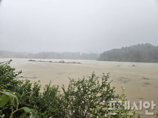▲ 17일 198㎜ 의 폭우가 쏟아진 광주 서구 풍암저수지 공원 목재 데크 산책로가 일부를 제외하고 모두 물에 잠겨 있다.2025.07.17ⓒ프레시안(김보현) |