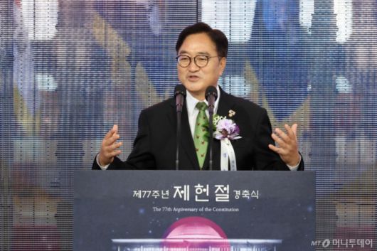 우원식 국회의장이 "시대의 요구에 맞게 헌법을 정비해야 한다"며 다시 한번 개헌을 강조했다. 이와 함께 2008년부터 쉬지 않는 국경일이 된 제헌절을 공휴일로 재지정하는 것을 제안했다.
