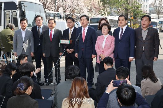 윤석열 전 대통령의 탄핵심판 선고기일인 지난 4월4일 서울 종로구 헌법재판소 앞에서 국민의힘 의원들이 입장을 밝히고 있다. 최근시도당위원장에 선출된 구자근, 정동만, 이철규, 조배숙, 박성민 의원 등이 자리했다. 사진공동취재단 |