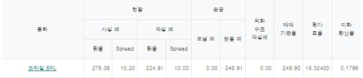 현찰 거래 기준으로는 브라질 헤알을 살 때 275.36원, 팔 때 224.90원이며, 송금 받을 때는 246.89원이 적용된다.