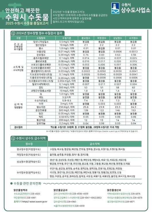 수원시상수도사업소는 수돗물 원·정수 수질 기준, 수질 검사 결과와 수돗물 생산·공급 과정, 수돗물 관련 상식 등을 수록한 '2025 수원시 수돗물 품질보고서'를 제작해 시민들에게 공개했다.