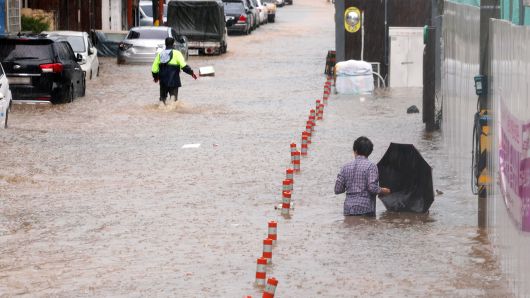 ▲ 호우경보가 발효된 17일 오전 광주 남구 백운광장 인근 상가와 도로가 물에 잠겨 있다.