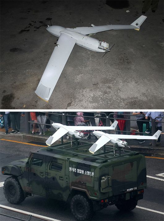 ▲ 지난해 10월 19일 북한 당 기관지 <로동신문>이 공개한 무인기 사진. 위쪽이 북한에서 공개한 평양 침투 무인기 사진이며 아래쪽이 남한에서 공개된 무인기 모습이다. ⓒ로동신문=뉴스1 |