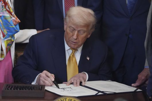 도널드 트럼프 미국 대통령이 16일(현지 시간) 미 워싱턴DC 백악관 이스트룸에서 '치명적 펜타닐 밀매 중단법(HALT Fentanyl Act)'에 서명하고 있다. 트럼프 대통령은 이날 인터뷰에서 인도와 무역 합의에 근접했으며, 소규모 국가 150개국에 10%나 15% 단일 관세를 부과할 것이라고 밝혔다. AP뉴시스 |