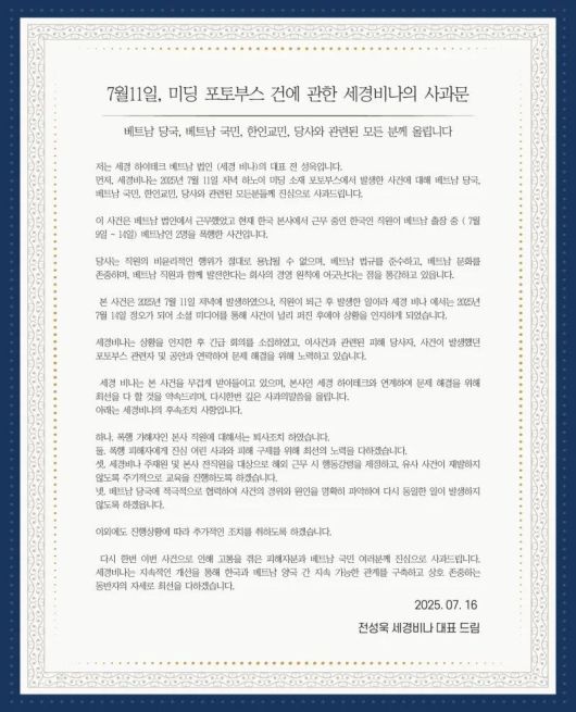 세경하이테크의 베트남 법인 세경 비나 사과문./온라인 캡처 |