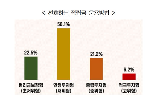 선호하는 적립금 운용방법으로는 ‘안정투자형(저위험)’이 50.1%로 가장 높았다. 이어 ‘원리금보장형(초저위험)’ 22.5%, ‘중립투자형(중위험)’ 21.2%, ‘적극투자형(고위험)’ 6.2% 순으로 높았다.
