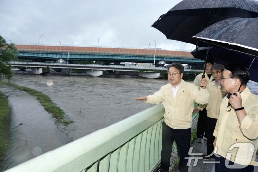 강기정 광주시장이 17일 홍수주의보가 발령된 서구 유촌교를 찾아 현장 상황을 긴급히 점검하고, 철저한 호우 대비를 지시하고 있다.(광주시 제공. 재판매 및 DB 금지) 2025.7.17/뉴스1 ⓒ News1 박준배 기자 |