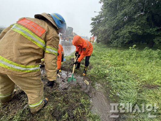 ▲17일 전북소방본부 대원들이 집중호우로 침수 피해가 우려되는 지역에서 배수로를 정비하고 있다 ⓒ전북소방본부 |