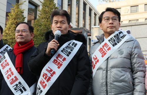 전 한국사 강사 전한길씨(가운데)가 지난 3월 14일 서울 종로구 헌법재판소 앞에서 열린 국민의힘 기독인회 ‘탄핵 각하 길’ 걷기 기자회견에서 발언하고 있다. [사진 출처 = 연합뉴스] |