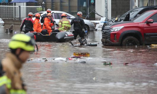 7일 오후 대구 북구 노곡동에서 119구조대가 보트를 타고 인명 수색을 하고 있다. 이날 갑작스러운 폭우로 노곡동 일대가 침수됐다. 연합뉴스 |