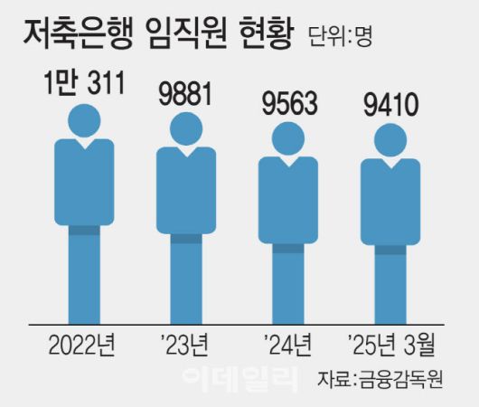 17일 금융감독원 금융통계정보에 따르면 지난 1분기 말 기준 전국 저축은행 79곳에서 근무하는 임직원의 수는 9410명이다. 직전 분기 대비 153명 감소했다. 특히 실무진이 대거 이탈했다. 정규직과 비정규직이 각각 120명, 38명이 업계를 떠났다. 임원은 오히려 5명 늘어난 732명으로 집계됐다.