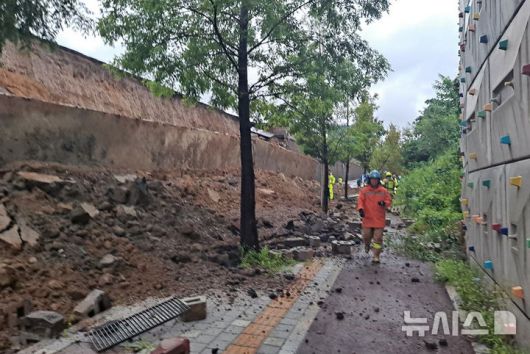 [오산=뉴시스] 김종택 기자 = 수도권 등 중부지역에 호우주의보가 발효된 16일 경기 오산시 가장교차로 옹벽이 도로로 무너져 차량을 덮치는 사고가 발생해 소방 당국이 대응 1단계를 발령, 구조작업을 벌이고 있다. (사진=경기도소방재난본부 제공) 2025.07.16. photo@newsis.com |