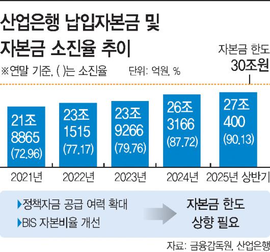 여당인 더불어민주당은 최근 한국산업은행의 법정 자본금 한도를 30조원에서 45조원으로 상향하는 법안을 발의했다. 올해 상반기 산업은행의 자본금 소진율이 90%를 넘어선 상황에서, 한도를 늘려 자금이 필요한 산업영역에 대한 대출 여력을 확대하고 자본비율을 개선하기 위한 목적이다. 법안이 통과된다면 지난 2014년 이후 11년 만에 한도 증액이 이루어진다.