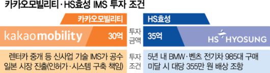 서울경제신문이 17일 단독 입수한 내부 계약서 및 사업 관계자 인터뷰에 따르면 2023년 HS효성은 IMS에 투자한 오아시스PE 펀드에 35억 원을 출자하는 조건으로 벤츠 등 수입 전기차 신형 총 985대 납품을 선제 조건으로 요구한 것으로 확인됐다.