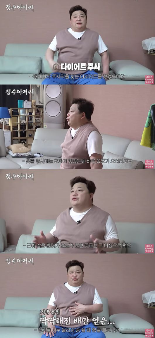 윤정수는 과거에도 꾸준히 다이어트를 시도해왔다. 첫 번째로는 다이어트 주사를 맞았다고 고백한 그는 "배에 주사약을 맞는 다이어트를 했다. 맞을 당시에는 효과가 있었는데 바로 요요가 오더라"며 "살을 뺐다가 요요가 오면 무조건 그 이상으로 찐다"고 털어놨다.
