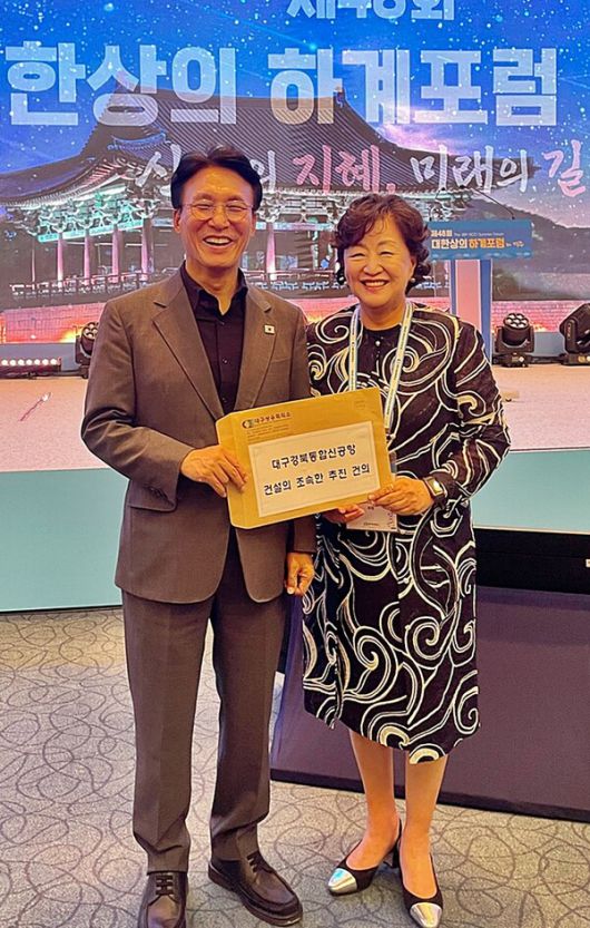 [박용 기자] [포인트경제] 대구상공회의소(회장 박윤경)는 지난 16일 라한셀렉트 경주 호텔에서 개최된 대한상의 하계포럼에서 김민석 국무총리에게 대구경북의 숙원사업인 '대구경북신공항 조속 건설'에 대한 건의서를 전달했다.