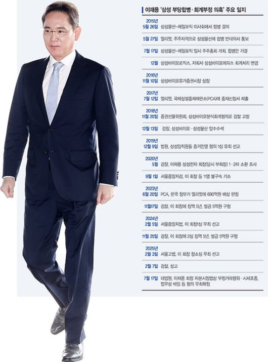 당시 이 회장은 제일모직 지분 23.2%를 보유하고 있었지만 지주회사 격인 삼성물산 지분은 없었다. 이에 따라 삼성물산→삼성생명→삼성전자로 이어지는 지배구조에서 이 회장이 삼성물산 지분을 안정적으로 확보할 수 있도록 했다는 게 검찰의 논리였다. 이 회장은 삼성물산에 불리한 합병이었다는 논란을 피하기 위해 제일모직 자회사였던 삼성바이오로직스의 4조5000억원대 분식회계에 관여한 혐의도 받았다.
