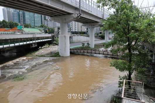 서울 전역에 호우주의보가 발효 중인 가운데 17일 서울 관악구 신림동 신대방1교 아래 도림천 물이 불어나 있다. 정지윤 선임기자 |