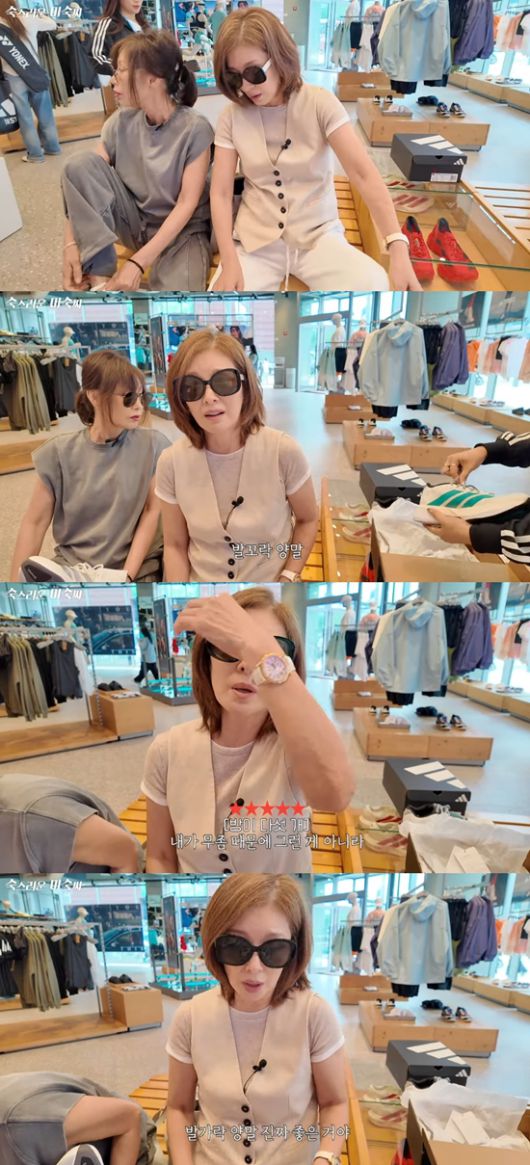 이미숙이 운동화를 직접 신어보기 위해 신발을 벗으려다 "찍지마"라며 카메라를 막았다. 그는 "발꼬락 양말"이라고 이유를 밝히며, "근데 이거에 대해서는 이야기를 해야 한다. 내가 무좀 때문에 그런 게 아니라, 발가락 양말이 진짜 좋은 거다. 나이 드신 분들께 발가락 양말을 꼭 신어야 한다고 적극적으로 권해야 한다"라며 양말을 칭찬했다.