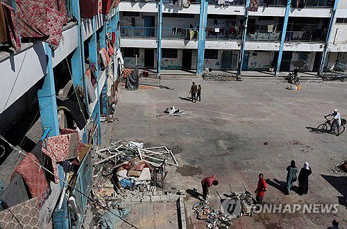 17일(현지시간) 가자지구 피란민들이 지내는 한 학교 건물이 폭격을 맞은 모습 |