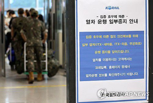역사 전광판에는 "집중 호우에 따른 일반열차 일부 운행을 중지한다"는 안내가 반복해서 나왔다.