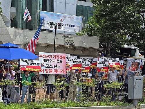(서울=연합뉴스) 최원정 기자 = 더불어민주당 은평을 지역위원회 당원들이 17일 오후 서울 은평구 진관동 은평제일교회 앞에서 모스 탄 미국 리버티대 교수를 규탄하는 집회를 열고 있다. 2025.7.17