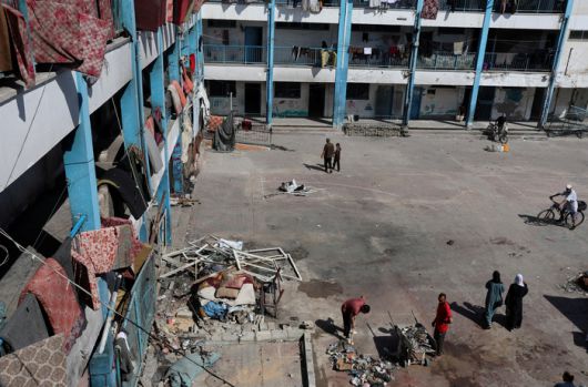 17일(현지시간) 가자지구 피란민들이 지내는 한 학교 건물이 폭격을 맞은 모습. [사진 로이터 연합뉴스] |