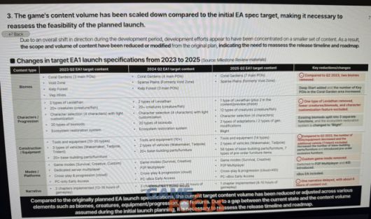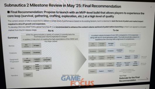 크래프톤의 이러한 주장은 외신 코타쿠가 단독 입수해 보도한 서브노티카 2의 2025년 5월자 개발 평가서에서 세부적인 내용이 명시돼 있다. 유출된 두 장의 슬라이드 이미지에서 크래프톤은 개발중인 서브노티카 2에 대해 “다양한 콘텐츠를 포함하고 있지만 후속작에 어울리는 신선함과 볼륨이 부족하다”는 요약 평가를 했으며 두 번째 슬라이드에서는 “원래 계획된 출시 사양과 비교했을 때 현재 콘텐츠는 다양한 요소가 감소됐거나 조절됐다. (중략) 현재 상태가 초기 출시 계획 당시 예상했던 콘텐츠 분량과 비교했을 때 차이가 많은 만큼 출시 일정과 로드맵 전체의 재평가가 필요하다”는 부정적인 평가를 내리며 목표로 했던 개발 프로세스 대비 완성도가 낮다고 지적했다.