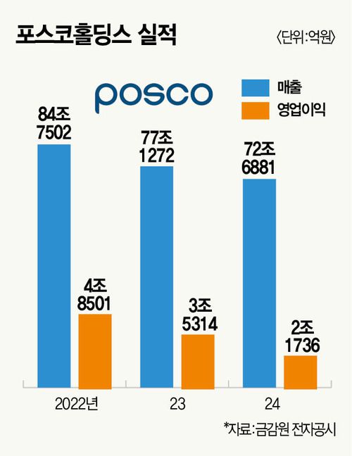포스코그룹 지주사 포스코홀딩스 영업이익 흐름이다. 한동안 5조원에 달하는 넉넉한 이익을 올렸지만 최근 실적 부진에 시달리면서 영업이익이 반 토막 났다. 특히 핵심 사업인 철강 부문 부진이 가장 문제다. 포스코의 지난해 영업이익은 1조4730억원에 그쳐 전년 대비 29.3% 감소했다. 매출도 37조5560억원으로 같은 기간 3.6% 줄었다.