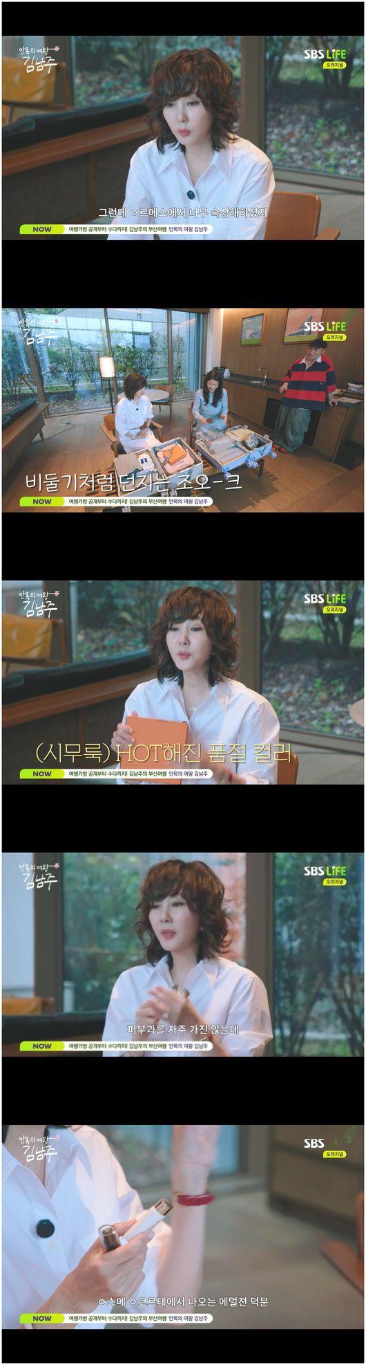 특히 김남주는 그의 변치 않는 물광 피부가 수십 년 간 화제가 됐다는 것을 잘 알고 있었다. 김남주는 파우치를 꺼내면서 머뭇거리다가 "진짜 광고 말고, 내가 쓰는 걸 말해주려고 한다"라고 말했다.
