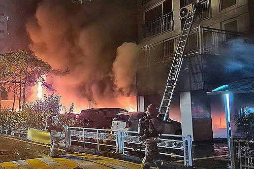 (광명=연합뉴스) 17일 오후 9시 10분께 경기도 광명시 소하동의 한 아파트 주차장에서 불이 나 소방대원들이 진화 작업을 하고 있다. 2025.7.17 [독자 제공. 재판매 및 DB 금지]