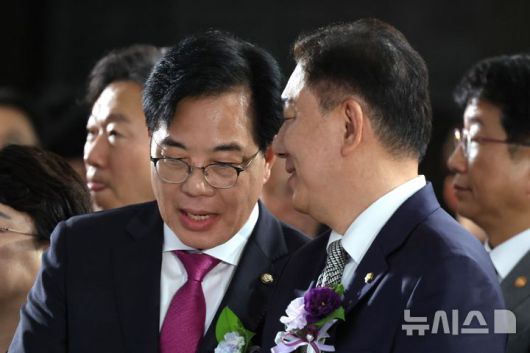[서울=뉴시스] 국회사진기자단 = 송언석 국민의힘 비대위원장 겸 원내대표와 김병기 더불어민주당 당대표 직무대행 겸 원내대표가 17일 서울 여의도 국회에서 열린 제77주년 제헌절 경축식에서 대화를 나누고 있다. 2025.07.17. photo@newsis.com |