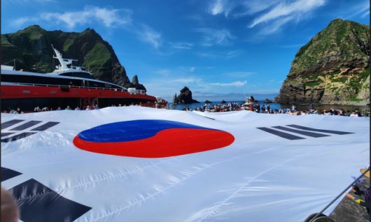독도에 펼쳐진 초대형 태극기 - ·광복 80주년을 맞아 지난 28일 시민 80명이 독도 동도 선착장에서 가로 30m, 세로 20m 크기의 초대형 태극기를 펼치고 있다. 연합뉴스·서경덕 교수 제공. |