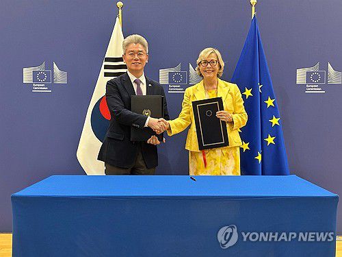 (브뤼셀=연합뉴스) 정빛나 특파원 = 유정현 주벨기에EU 대사(왼쪽)와 시그네 랏소 EU 집행위 연구혁신총국 부총국장이 17일(현지시간) 벨기에 브뤼셀에서 '호라이즌 유럽' 준회원국 가입을 위한 의정서에 서명한 뒤 교환하고 있다. 2025.7.18