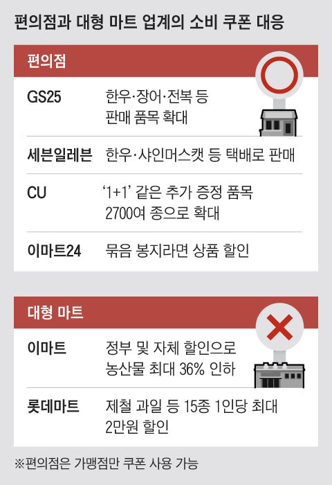 편의점은 주요 품목으로 취급하지 않던 한우, 장어, 전복까지 들여놓았다. 이번 기회에 대형 마트를 주로 다니던 소비자도 끌어오겠다는 계산이다. 반면 대형 마트는 소비자 발길이 끊길까 봐 당장 출혈을 감수하고 대규모 할인 행사를 벌일 계획이다. 소비 쿠폰이 쏘아 올린 변화가 유통가 대전으로 번지고 있는 셈이다.