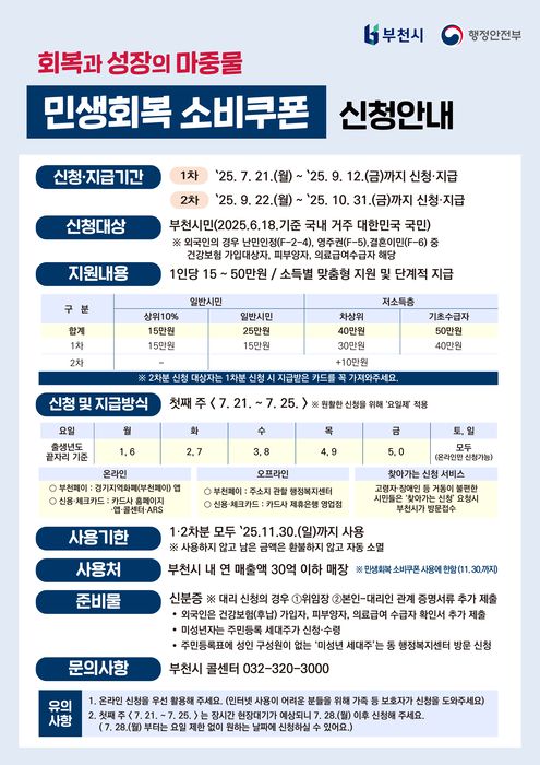 경기 부천시가 21일부터 정부 '민생회복 소비쿠폰' 1차 신청 접수에 들어간다.