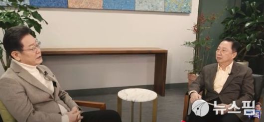 이재명 대통령이 미국 특사단장에 박용만 전 두산그룹 회장(전 대한상공회의소 회장)을 임명했다. 사진은 2022년 '만문명답' 대담을 진행 중인 이재명 당시 대선 후보와 박 전 회장 [사진=이재명 유튜브 캡쳐] |