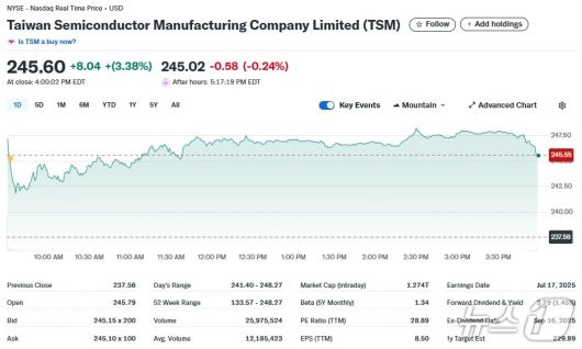 (서울=뉴스1) 박형기 기자 = 대만의 TSMC가 전일 깜짝 실적을 발표, 미국증시에 상장된 TSMC의 주가가 3.38% 급등한 245.60달러를 기록했다. 이는 사상 최고치다.