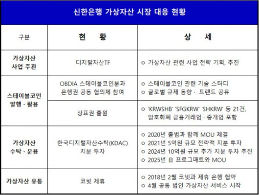 특히 올해 2월 금융위원회가 법인 가상자산 실명계좌 개설·거래 허용에 대해 발표하면서, 신한은행은 코빗과 함께 상장법인·정부기관 대상 가상자산 솔루션 도입과 커스터디 기반 시장 진입을 공식화했다.