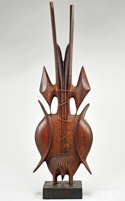 문신의 ‘무제’(1978). 조각과 건축적 조형에 눈뜨게 된 프랑스 시절 제작했다. 타원, 마름모, 선 등의 리드미컬한 조합으로 빚은 형상은 악기를 연상시킨다. 작가는 원과 구, 선을 기본으로 무한히 변화하는 추상조각을 지향했다. 작은 조형 단위를 반복적으로 배열한 ‘좌우대칭’은 주요한 특징. 덕분에 작가의 조각은 지구나 우주 어딘가에 존재할 듯한 생명체를 떠올리게도 한다. 흑단이 주재료인 목조각이다. 프랑스에서 자주 사용한 흑단은 국내에선 구하기 어려웠다고 한다. 지난 5월 1일 국립현대미술관 서울에서 개막한 ‘MMCA 서울 상설전: 한국현대미술 하이라이트’에 나왔다. 흑단, 114×34×20㎝. 국립현대미술관(이건희컬렉션) 소장. |
