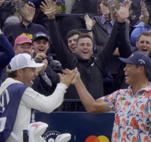 김시우가 2024년 디 오픈 3라운드 17번 홀에서 홀인원을 작성한 뒤 캐디와 기뻐하고 있다. 사진제공=김시우 인스타그램 |